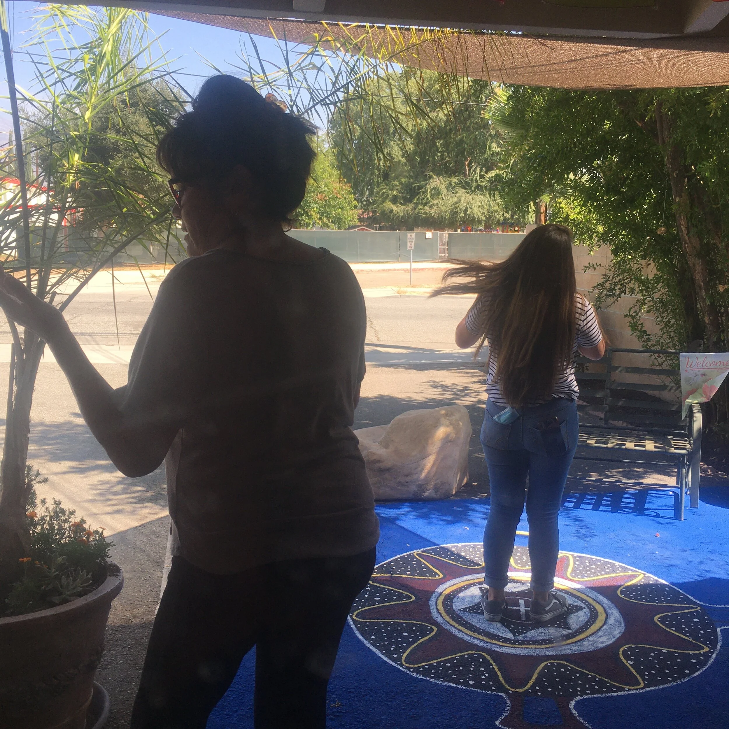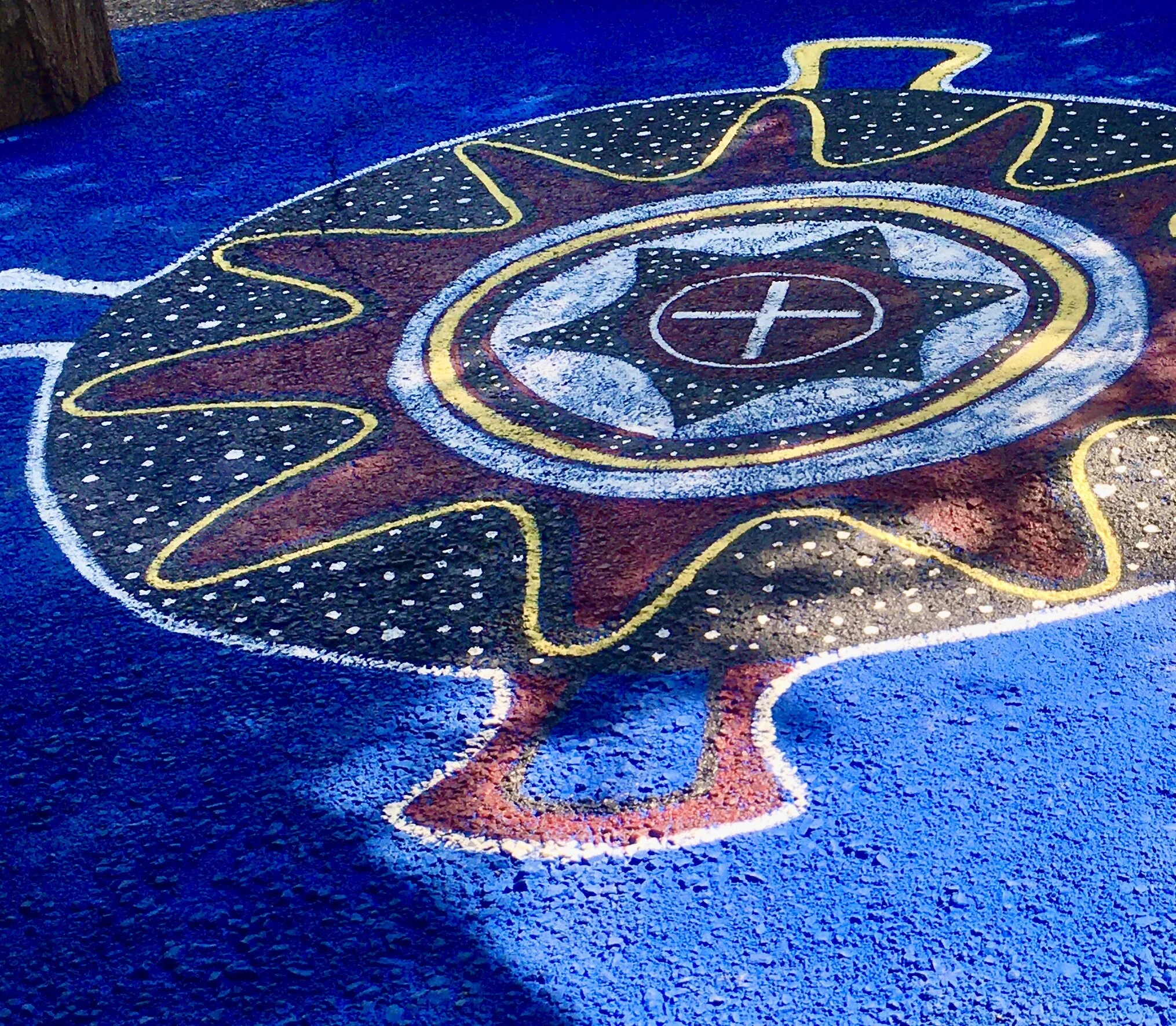 Installation Specs: 4 foot wide medicine wheel and wall chalk art based on existing Chumash art. Intention/Prayer ties (filled with sage) to hang on sacred tree. Four direction prayers painted on logs based upon Chumash directions.